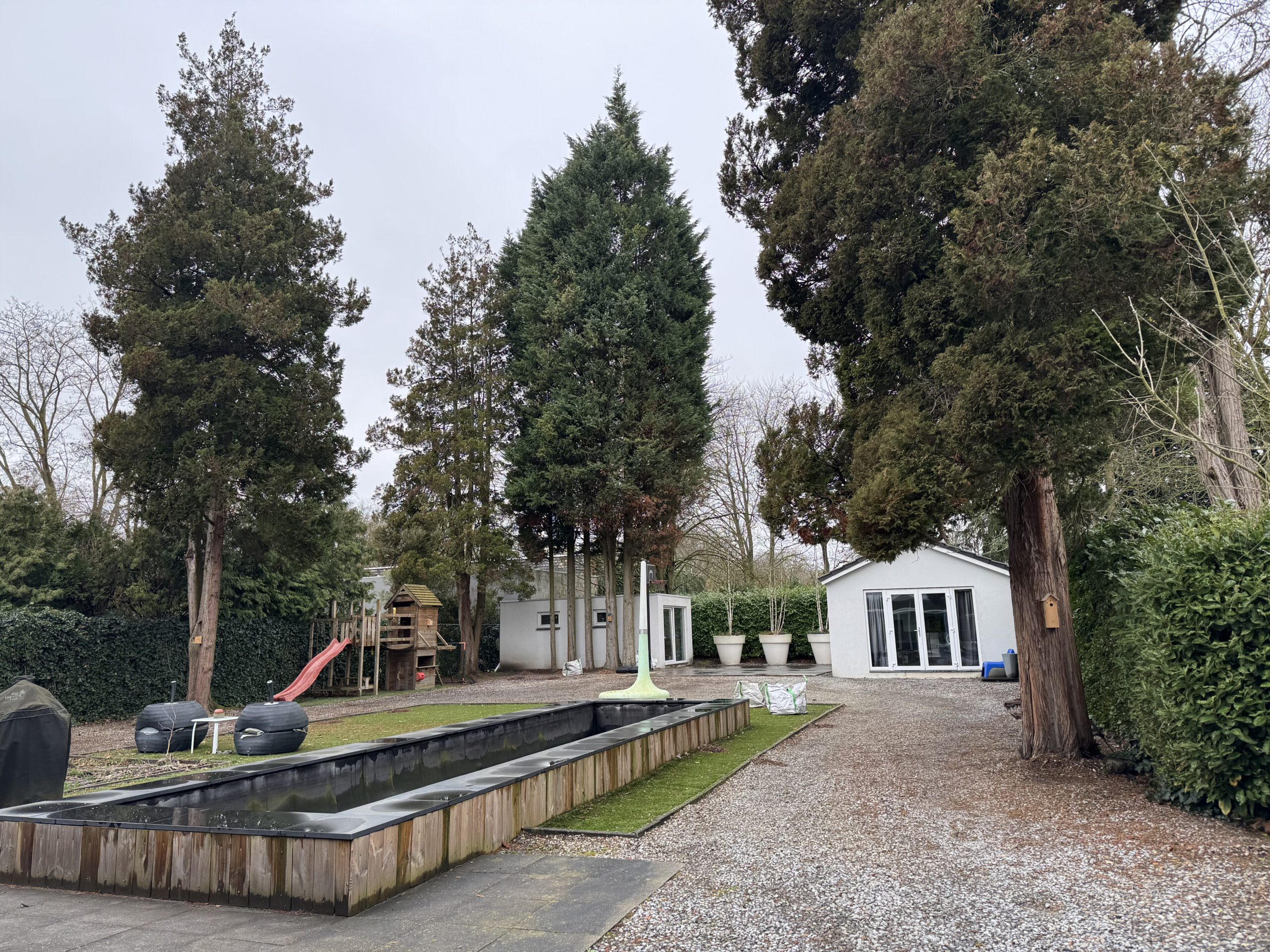 The plot is fully enclosed, making it ideal for families with small children. There is an outdoor children’s play set. Private parking is available for at least 4 cars on the premises.